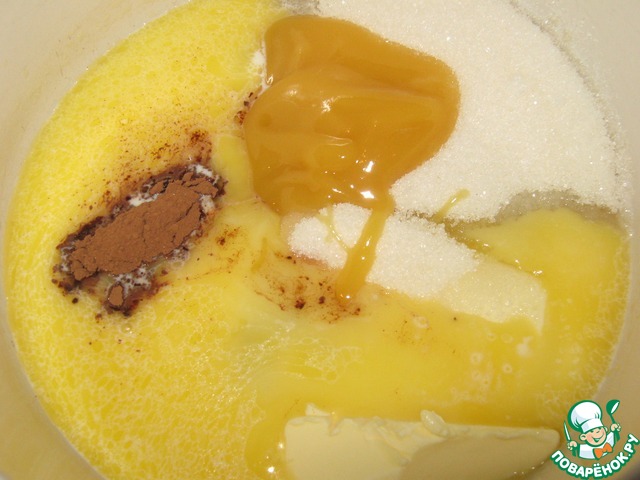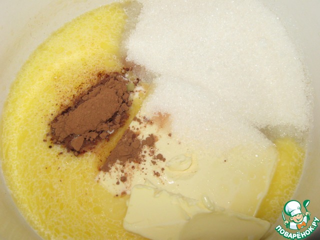 Растопить на огне сливочное масло (можно топлёное), добавить сахар, молоко, какао.