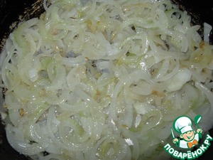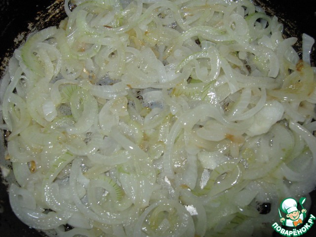 Лук нарезать тонкими полукольцами, обжарить на растительном масле.