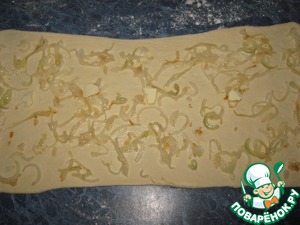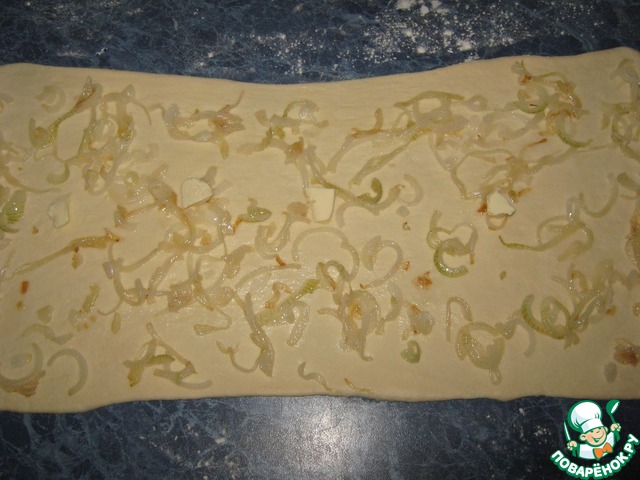 Тесто поделить на две части. Одну из них раскатать в прямоугольник, подпыляя стол мукой. Выложить половину обжаренного лука и кусочки сливочного масла.