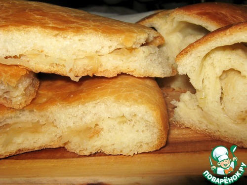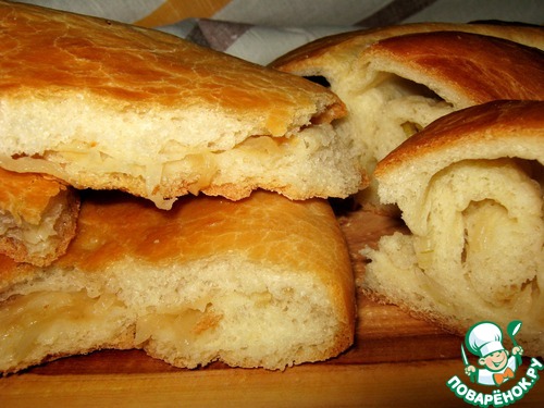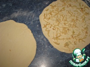 Вторую часть теста поделить пополам и раскатать. На одну выложить лук, накрыть второй частью теста.