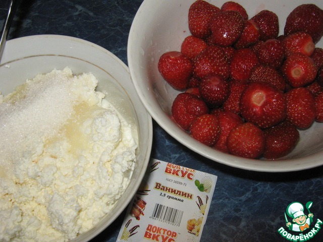 Клубнику помыть, почистить. К творогу добавить молоко, ванилин и сахар.