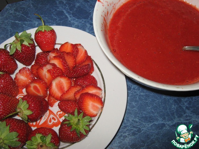 Часть клубники нарезать на пластины. Крупные ягоды оставить для украшения.