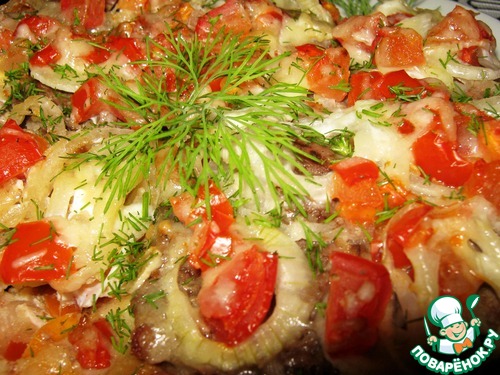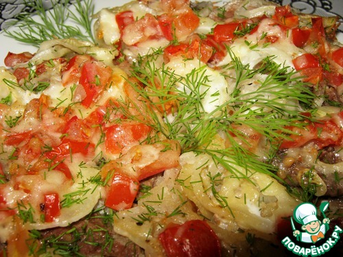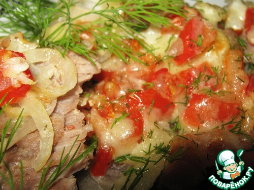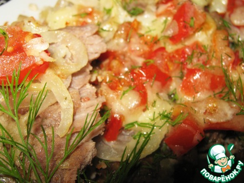 Выложить мясо. Лук, тонко нарезанный кольцами, затем помидоры. Присолить, посыпать специями.