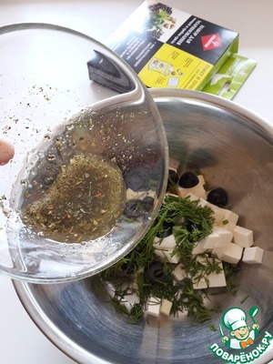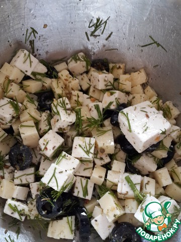 • Брынзу и твердый сыр нарежьте маленькими кубиками, добавьте нарезанный маслины, укроп и измельченный чеснок. Влейте сюда остатки маринада
