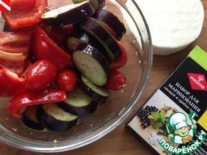 Подготовить овощи - вымыть, обсушить. Перцы нарезать на 8 частей, баклажан на колечки, толщиной 5-6 мм. Смешать с маринадом и оставить мариноваться на 15-20 минут.