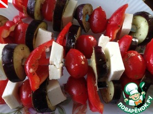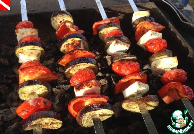 Адыгейский сыр ( в оригинальном рецепте используется сыр Халлуми, но в наших краях такого днем с огнем не сыщешь) нарезать небольшими кусочками. Замаринованные овощи и сыр нанизать на шампуры в произвольном порядке. Помидоры черри лучше всего подходят для гриля, так как их можно готовить целиком, они не теряют свой сок и хорошо сохраняют форму