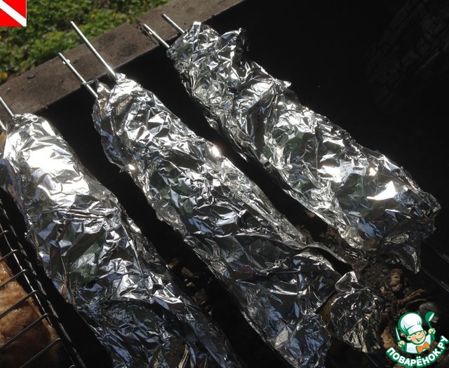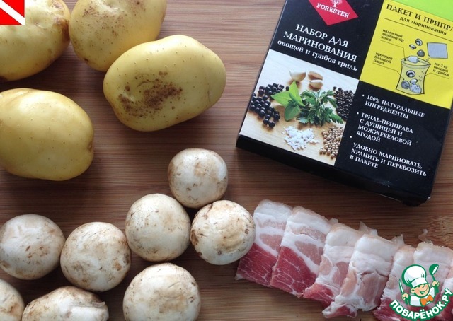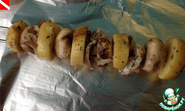 Картофель, бекон, грибы нанизать на шампуры. Я использовала двойные шампуры Forester - очень удобно - продукты на них не крутятся. Каждый шашлычок завернуть в фольгу.