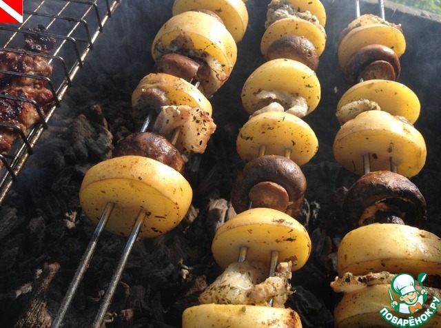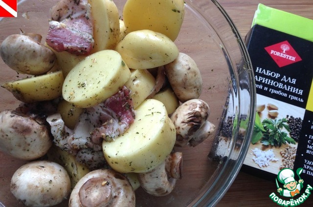 Подготовить продукты для шашлыков: картофель (у меня молодой) вымыть, просушить, нарезать на кусочки желаемого размера; грибы я не мою - просто протираю влажной, а затем сухой тряпочкой; бекон нарезать.