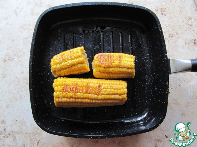 Початок кукурузы довести до готовности, затем обжарить на сковороде гриль.