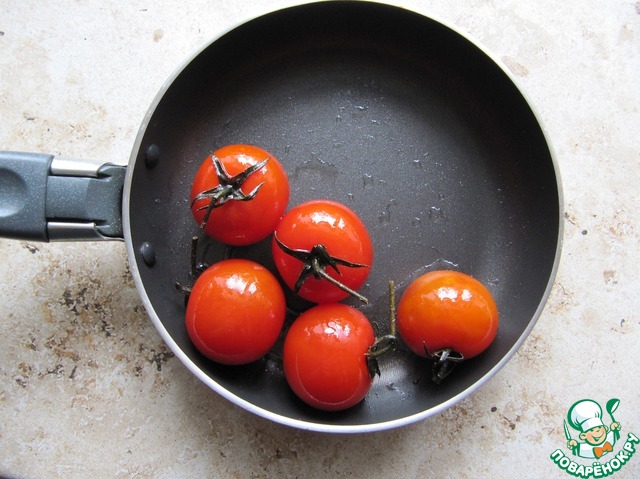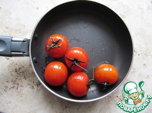 Часть помидор черри нарезать половинками, а часть притомить на разогретой с растительным маслом сковороде.