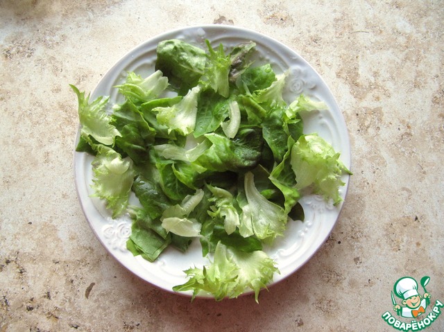 Растворить тростниковый сахар в яблочном уксусе, добавьте 6 ст л оливкового масла, перемешать до растворения сахара. Количество составляющих нужно регулировать под свой вкус! Листья салата нарвать на удобные для употребления кусочки. Соединить все ингредиенты, сбрызнуть заправкой для салата, грецкие орехи крупно поломать и украсить ими салат.