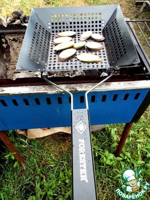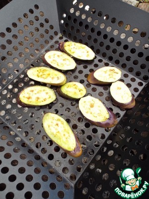 Решетку смазать маслом. Выложить баклажан. -