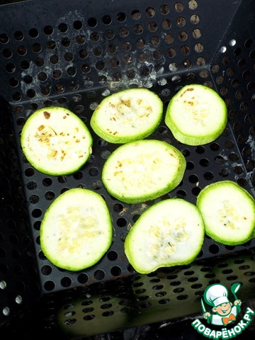 Кабачок нарезать тонкими кружочками. Немного посолить.