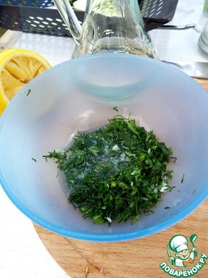 Зелень с чесноком заправить маслом и добавить сок лимона.