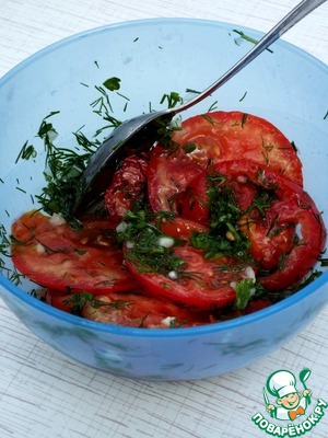 Сложить к зелени кружочки помидоров и аккуратно перемешать.