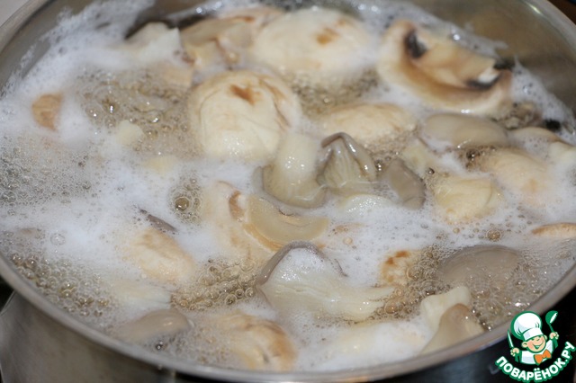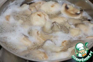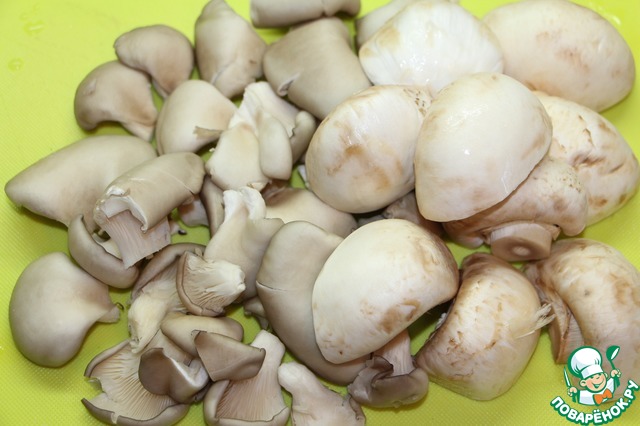 Если шампиньоны мелкие, то только подрезать ножку, если крупные, разрезать пополам. Вешенки срезать с грозди.
