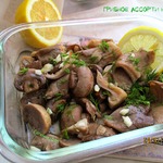 Выложить грибы на тарелку, полить лимонным соком и посыпать рубленым чесноком и зеленью.