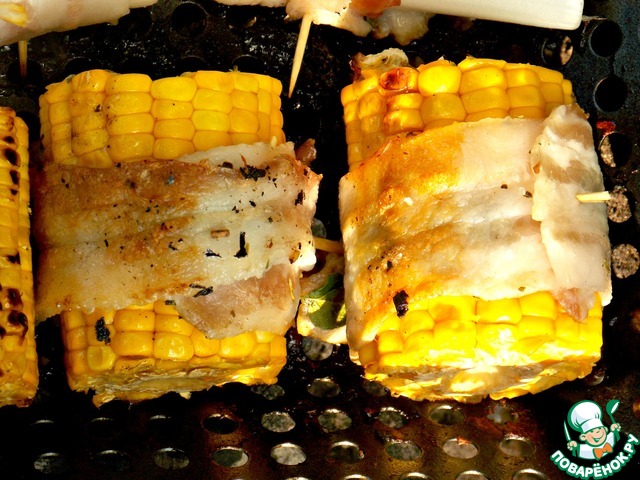 Соединить бекон по два (если надо), обвернуть беконом кукурузу и закрепить зубочистками.