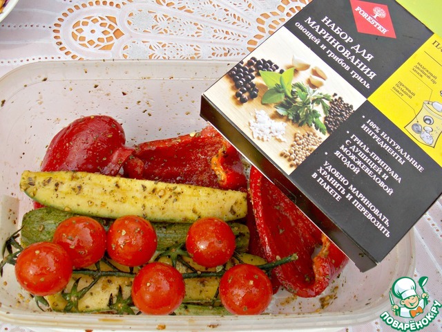 • Овощи помыть, перец и кабачки порезать на средние куски. Всыпать приправу, перемешать. Добавить уксус, масло растительное, тертый чеснок, перемешать и дать замариноваться около одного часа в специальном пакете, который прилагается к приправе "Forester".