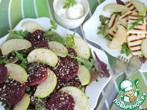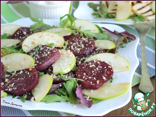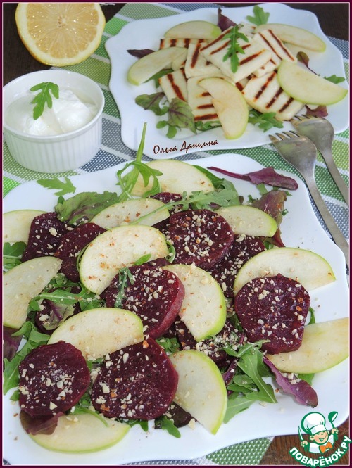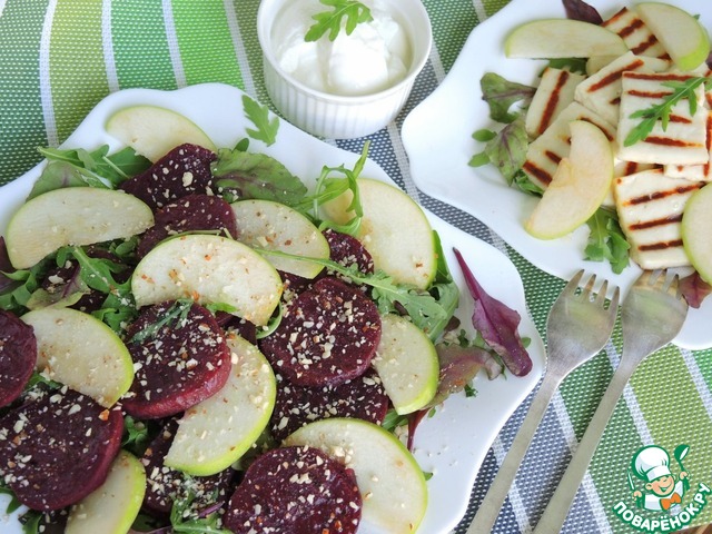 • На большую тарелку сначала выложить чистую, сухую зелень, сверху выложить теплую свёклу и ломтики яблока вперемешку. Слегка посолить, поперчить и посыпать дроблеными орехами. На отдельную тарелку выложить обжаренный сыр. Йогурт можно смешать с мелко порубленным чесноком и бальзамическим кремом, а можно подать это всё по отдельности и каждый заправить себе по вкусу.