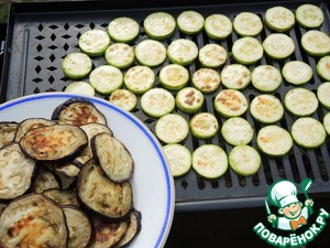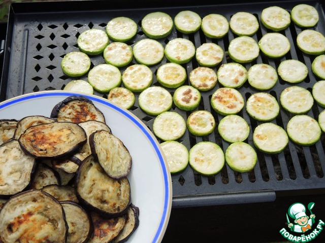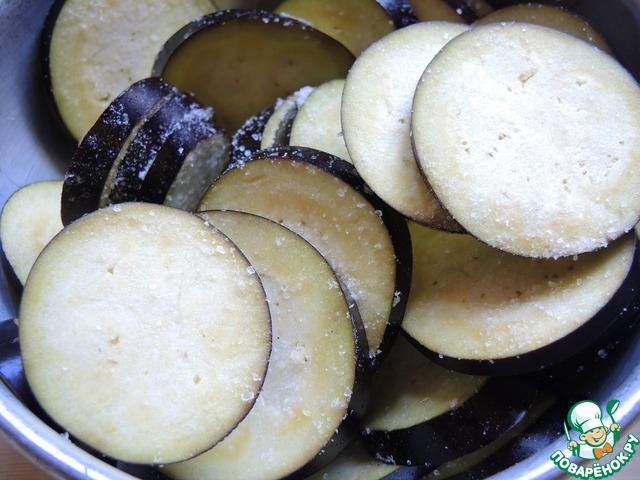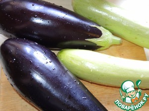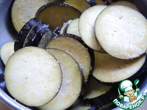 Баклажан нарезать кружками, положить в дуршлаг, обильно посолить и оставить в раковине на 10-15 минут. Кабачки нарезать кружками непосредственно перед обжаркой.