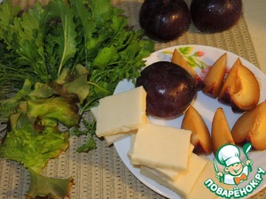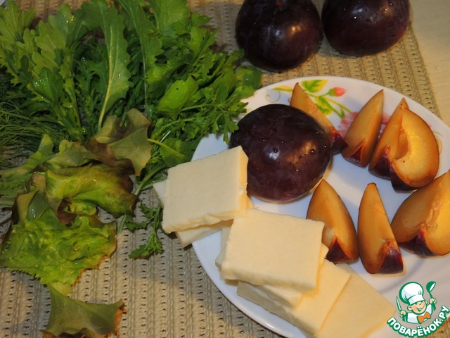 Сыр нарезать небольшими ломтиками, толщиной 1-1,5см, сливы нарезать на дольки. Зелень помыть и обсушить.