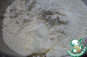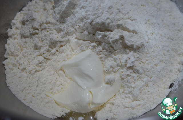 Муку просеять + соль, добавить в жидкую массу. Выложить 90 г. сметаны.