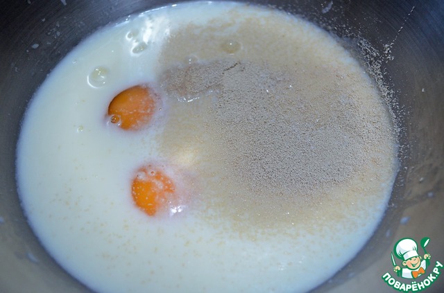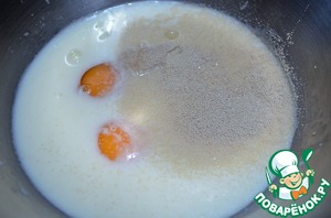 В дежу комбайна вылить теплое молоко, яйца, сахар и дрожжи. Перемешать.