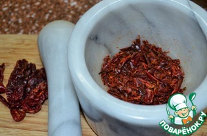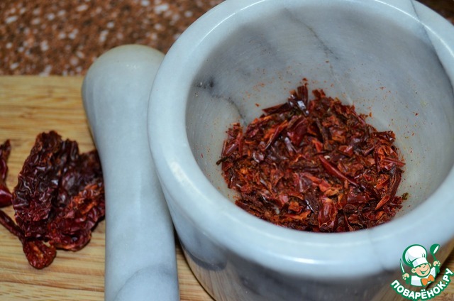 Пока замешивается тесто, сушеный перец истолочь в ступке или измельчить другим способом.