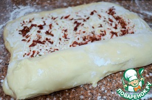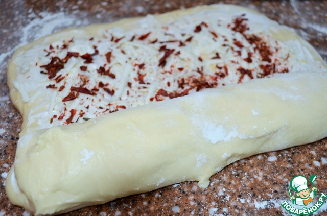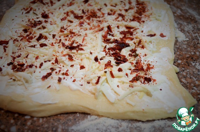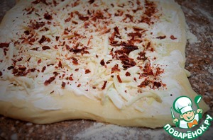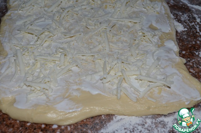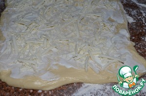 Выложить тесто на припыленный мукой стол, разделить на две части - 1/3 и 2/3. Большую часть размять руками или раскатать скалкой, смазать 10 г. сметаны. Сыр натереть и распределить по тесту.