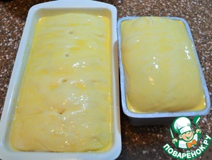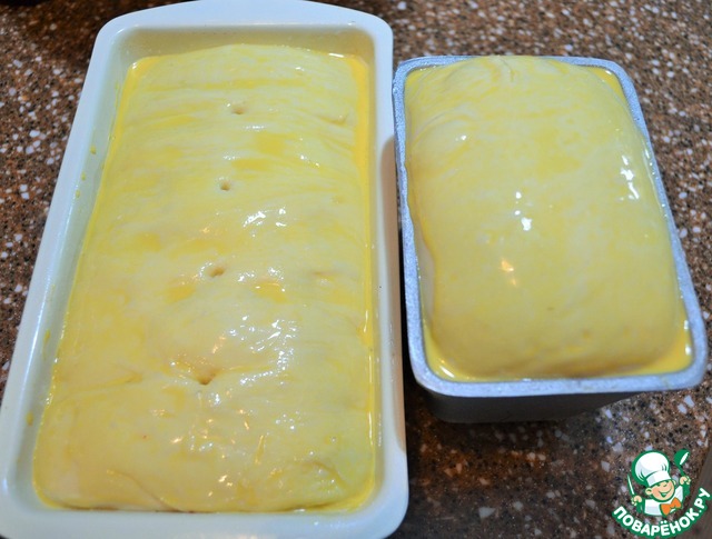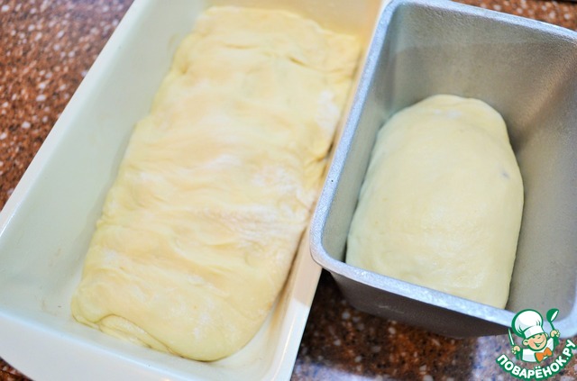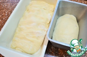 Выложить в смазанную маслом форму, на 1,5 л.. Вторую, меньшую часть сформовать рулетом без начинки и выложить также в смазанную форму, 0,9 л. объемом. Накрыть пленкой и на расстойку на 1,5 часа.