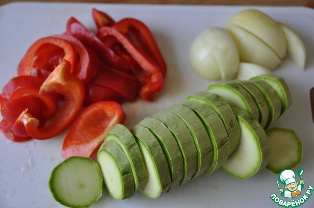 Овощи моем, чистим. Цуккини режем полукольцами, репчатый лук сегментами, болгарский перец полосками.