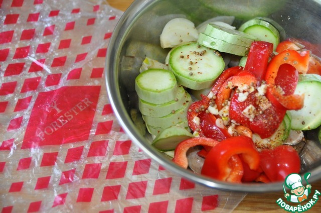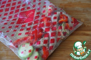 Кладём овощи и колбаски в пакет для маринования Forester и оставляем мариноваться на 1 час.