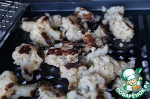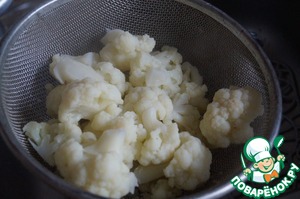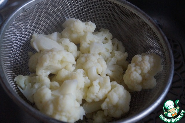 Цветную капусту разобрать на соцветия и припустить в слегка подсоленой воде. Отбросить на дуршлаг и дать ей стечь.