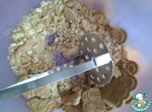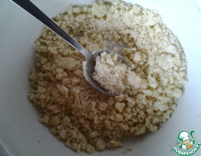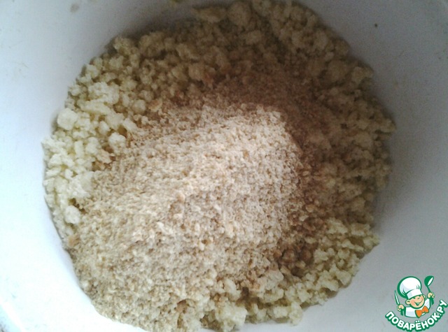Измельченное печенье добавить к мучной смеси и растереть до получение мелкой крошки.