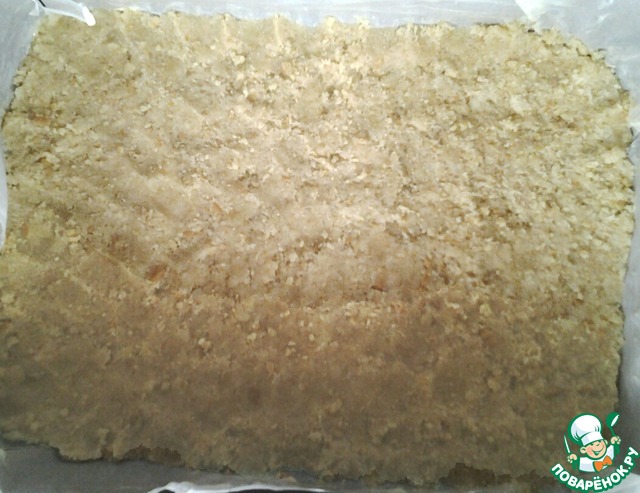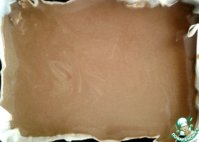 Шоколадное тесто вылить поверх приготовленной ранее песочной основы. И выпекать в предварительно разогретой до 180 градусов духовке 20-25 мин. Готовое тесто остудить, не извлекая из формы. -