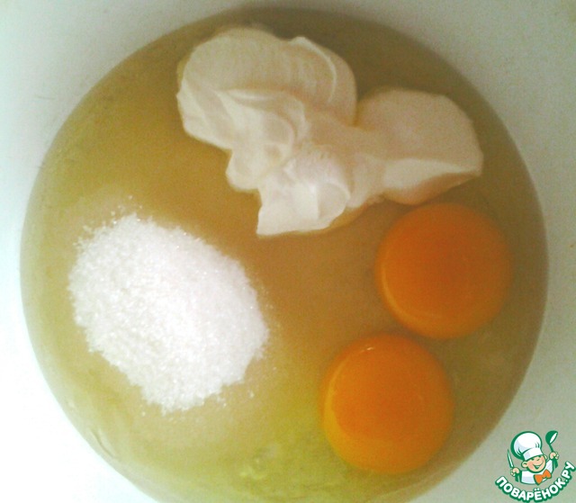 Приступим к приготовлению шоколадного теста. Для этого надо смешать йогурт, яйца, сахар и масло.