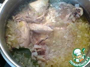 Курицу нарубить порционно, снять кожу. В кастрюлю выложить куски курицы и залить холодной водой, чтобы только прикрыть курицу. Когда вода закипит, огонь убавить и оставить вариться курицу еще на 15 минут. Далее добавить лавровый лист и лук мелко порезанный кубиком. Дать закипеть.