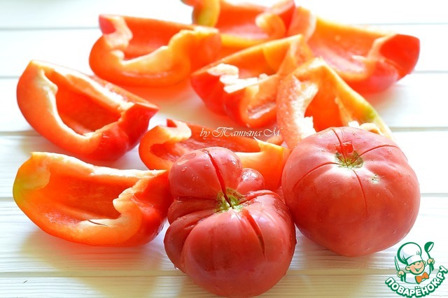 Перцы освободить от семян, разрезать на 4 части, у помидор надрезать крест-накрест мякоть у плодоножки (это делается для того, чтобы помидор при жарке не лопнул внизу и не потерял свой сок);