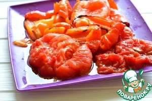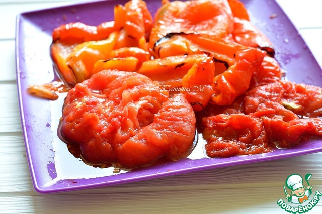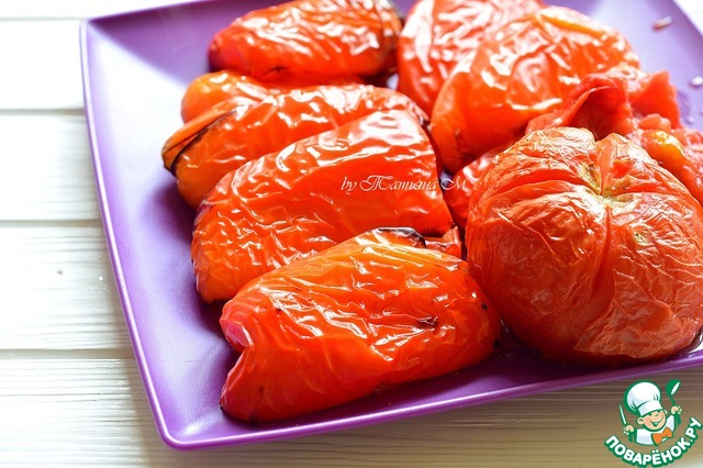 Перец и помидор жарить до мягкости на решетке или на противне на углях, помидор не переворачивать, а перцы перевернуть 1 раз;