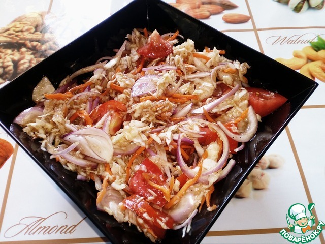 Салат из молодой капусты с помидором, морковью, лимоном, луком и чесноком. Салат заправлен соевым соусом KIKKOMAN, лимонным соком, подсолнечным маслом и красным перцем. Отличная закуска. Очень нравится салат, когда он постоит в холодильнике ночь, хотя вкусен и сразу.