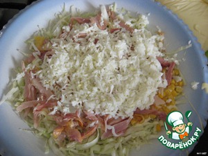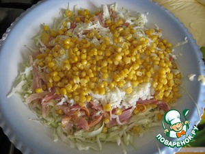 Поверх капусты укладываем соломкой порезанный окорочок и натертые на терке белки.