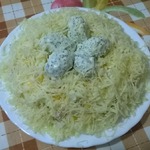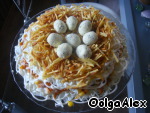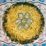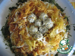 Катаем из желтковой смеси шарики. Делаем в центре салата углубление и укладываем туда шарики. Сверху посыпаем оставшийся капусткой.