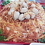 В этом салате очень необычное сочетание продуктов... Капусточка для свежести, копченая курочка для аромата и сытости, кукуруза, чтобы связать все вкусы воедино, и вкуснейший контраст соломки жаренного картофеля, который ставит жирную точку в этом букете вкусов... Но на этом сюрпризы не заканчиваются, в середине уложены яичные желтики в смеси из майонеза и чеснока, а приятной неожиданностью является мак, который так приятно потрескивает на губах и придает необычный вкус этому блюду. Еще один большой плюс этого салата, что его можно сделать БЕЗ МАЙОНЕЗА и с варенной курочкой, тогда он станет почти диетическим, но вкус будет не менее вкусный, просто салатик станет легче.