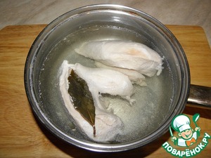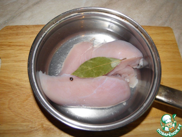 Отварить куриное филе с лавровым листом и перцем горошек (до готовности, в районе 20 мин.), (лучше положить уже в кипящую воду), в конце посолить.