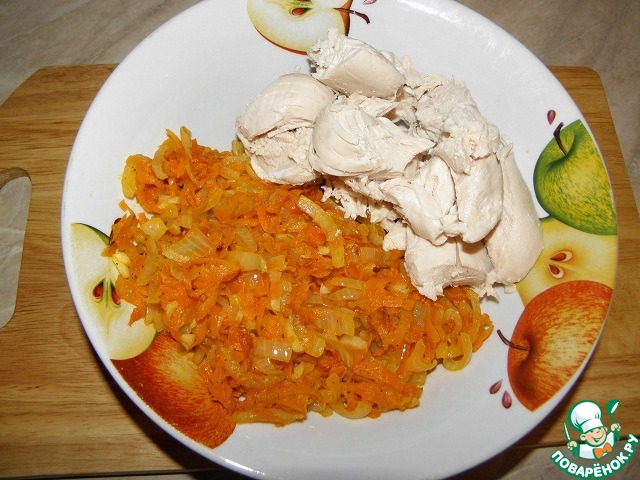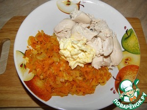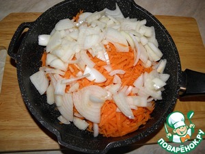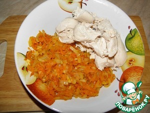 Тем временем натереть морковь, лук нарезать, обжарить до готовности, добавить любимые специи.