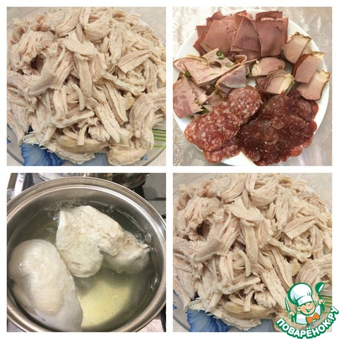- Ветчина (я брала мясной хлебец и мяско копченое) — 200 г