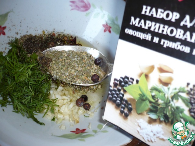 Для маринада: соедините мелко нарезанный чеснок, мелко нарезанные укроп и петрушку, добавьте немного сушеного орегано, черного молотого перца и сушеного перца чили (легкая острота запеченным перцам совсем не повредит), приправу для овощей и грибов "Forester", посолите, влейте оливковое масло и сок лимона и все хорошо перемешайте.