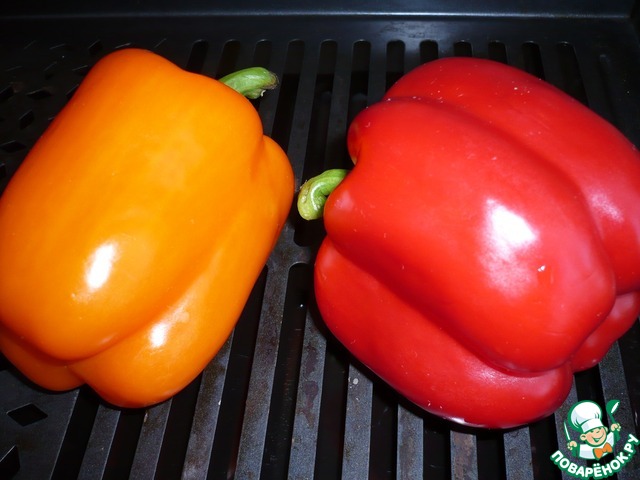Уложите перцы на противень-гриль "Forester". Готовьте их до появления основательных подпалин, время от времени поворачивая.
