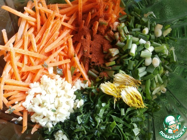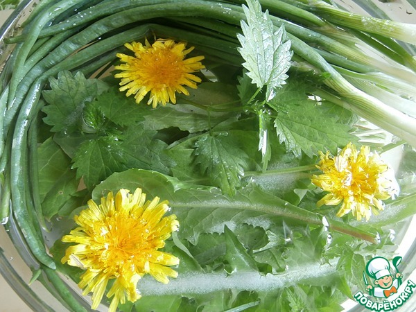 - Зелень (зеленый лук, черемша или свежие перья чеснока, щавель, одуванчик, крапива и т.д.) — 1 пуч.